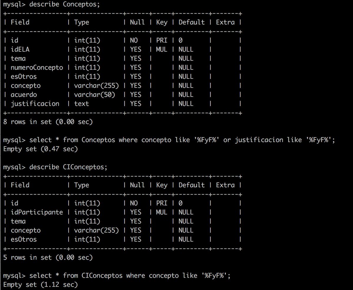 No se deje engañar por esto https://twitter.com/felicesforrados/status/824288844749176833 … #"FyF" en actas del proceso constituyente = 0 "Empty set" en la consulta en mysqlpic.twitter.com/Km9MUafcHV
