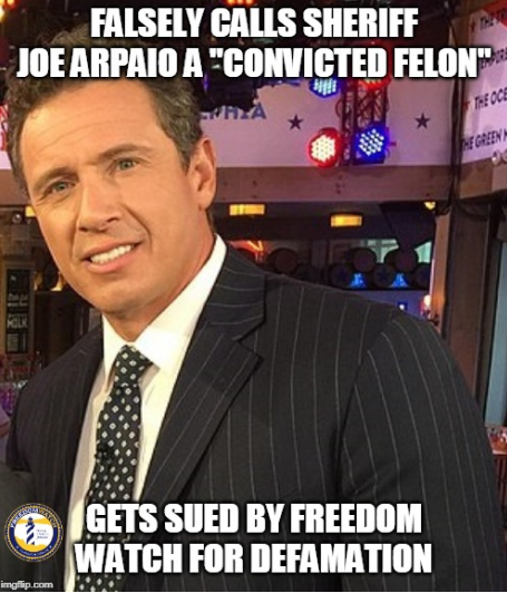 FREEDOM WATCH IS SUING CNN’S CHRIS CUOMO FOR DEFAMATION ON SHERIFF JOE ARPAIO’S BEHALF FOR FALSELY CALLING SHERIFF ARPAIO A “CONVICTED FELON.” http://ow.ly/IrBn50vZHW9 pic.twitter.com/HICguDESpE