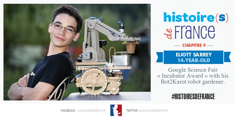He created a robot that can do your gardening for you and won the #GoogleScienceFair at 14 ! http://www.gouvernement.fr/en/eliott-sarrey-bot2karot-is-the-link-between-the-virtual-and-the-real-between-gardening-games-and …pic.twitter.com/0laLSOlet4