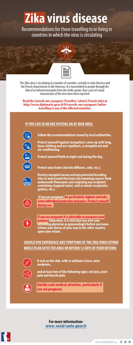 ⚠ #Zika virus: recommendations for those travelling to or living in an affected area >> http://www.gouvernement.fr/en/zika-virus-protecting-ourselves-against-it …pic.twitter.com/SPeKOwcFeV