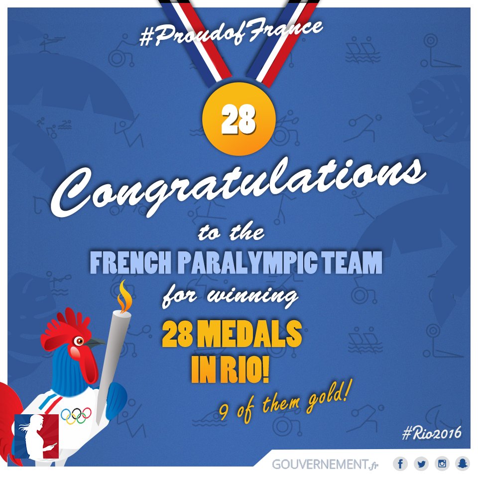 Congratulations to the French paralympic team for winning 28 medals in #Rio2016, 9 of them gold! cc @FRAparalympique