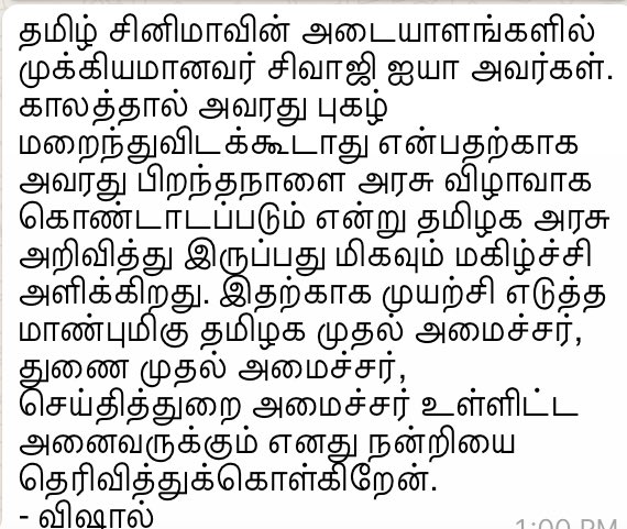 கலைமாமணி, பத்மஸ்ரீ, பத்மபூஷன், செவாலியே நடிகர்திலகம் திரு.சிவாஜிகணேசன் அவர்களின் பிறந்தநாளான அக்.1 ம் தேதியை இனி ஒவ்வொறு ஆண்டும் அரசு விழாவாக கொண்டாடப்படும்.தமிழக அரசுக்கு நன்றி ! -