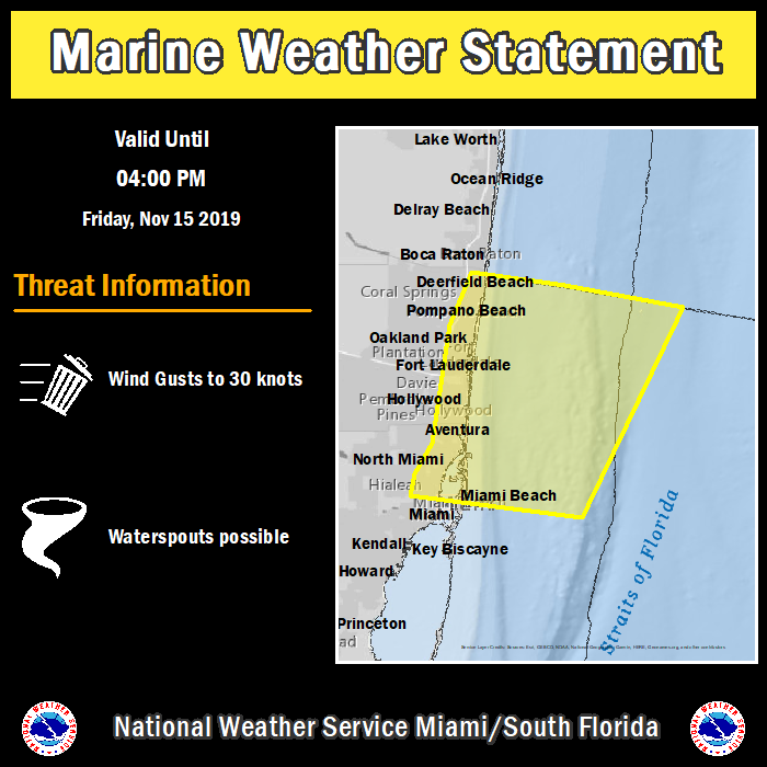 Nov 15 @ 3:00 PM - Strong thunderstorms approaching the waters off Broward and northern Miami-Dade Counties, capable of producing wind gusts to 30 knots and waterspouts.