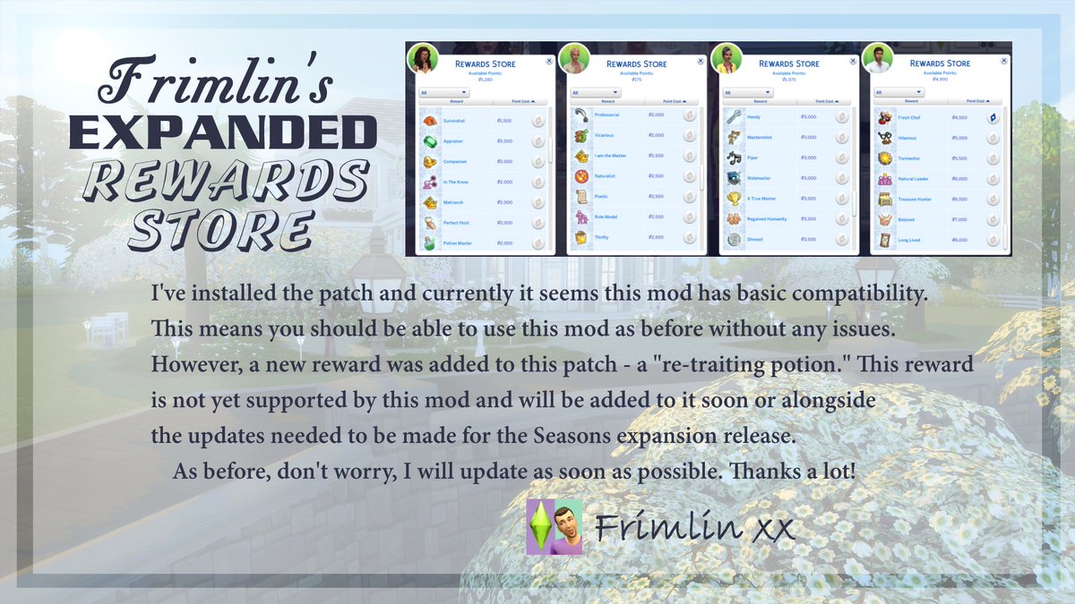 My mod "Frimlin's Expanded Rewards Store" (http://www.modthesims.info/download.php?t=612040 …) has basic compatibility with the patch.