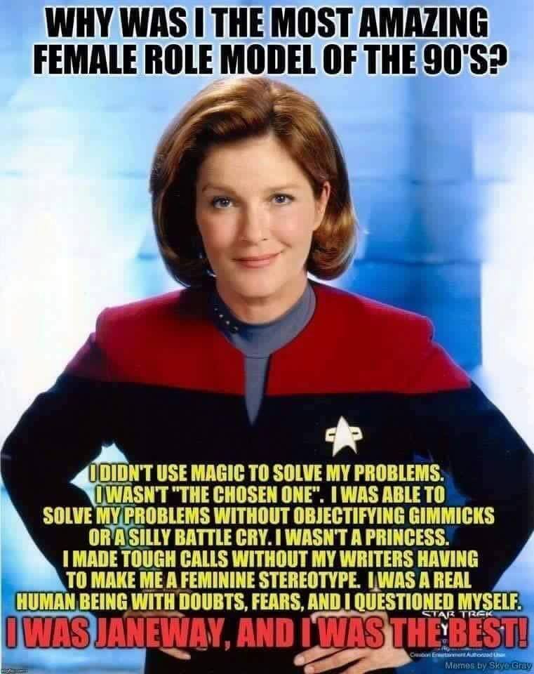 I've been binge watching my way through Star Trek and I just started Voyager (after finishing TNG and DS9) and I'd forgotten how truly awesome Janeway is.pic.twitter.com/rAbXnaHlfe