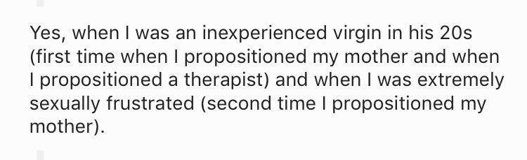 But I remember reading a thread where a dude said that his mother should be willing to have sex with him to alleviate his virginitypic.twitter.com/LNTdIMX8SN