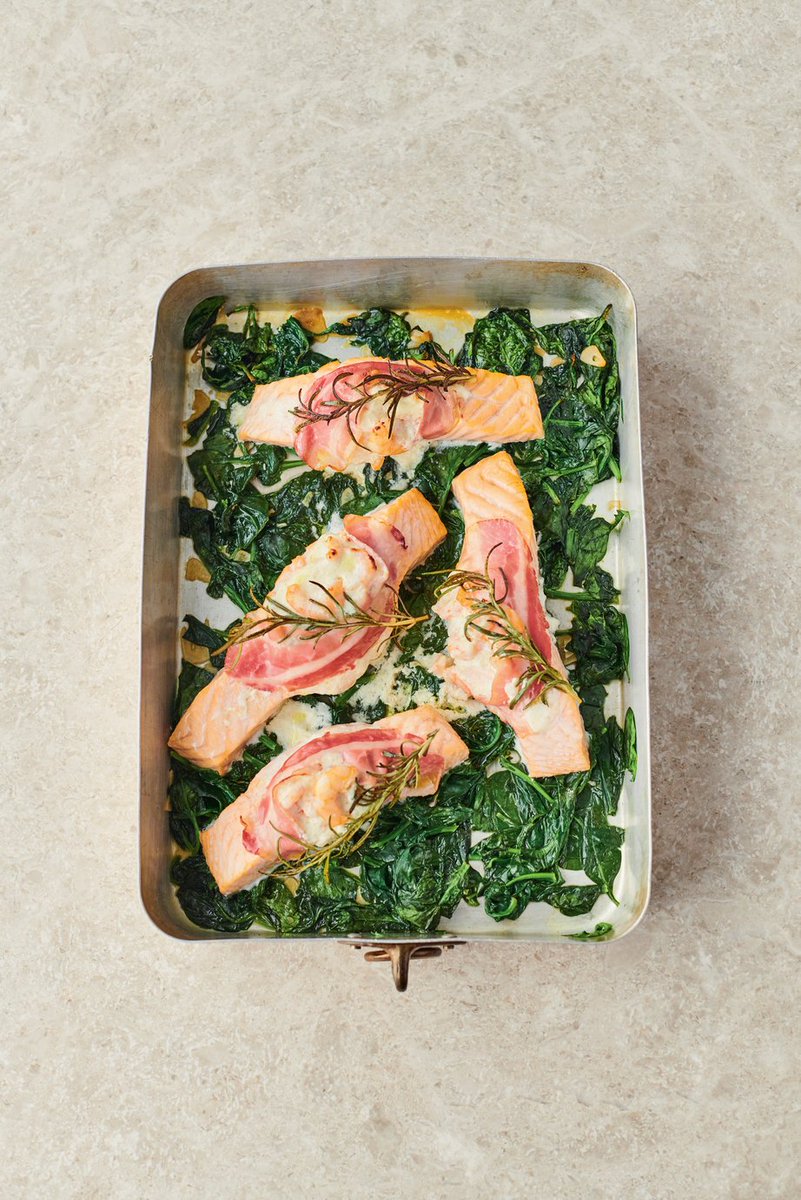 First up a new twist on a fish supper. Jamie’s creamy prawn-stuffed salmon