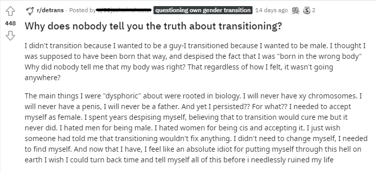 Follow the link if you want to join a more private place to share thoughts/feelings about transitioning, detransitioning and trans culture in general.