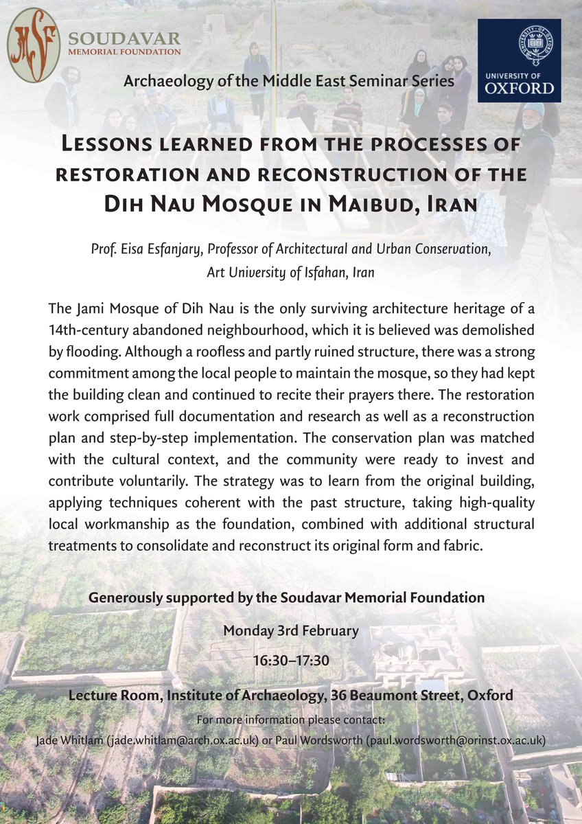 If anyone's in Oxford on the 3rd Feb, come and hear our next Archaeology of the Middle East Seminar Series (AMESS) lecture, with Prof. Eisa Esfanjary (Isfahan)pic.twitter.com/GZMHHeYEyY