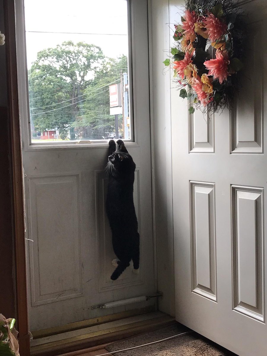 This is Binx. He just discovered that he can hang from the door and see outside. And somehow this outside is different then the one in the large window he can hang out in 2 ft to the left.pic.twitter.com/Lzr0dYOH0M