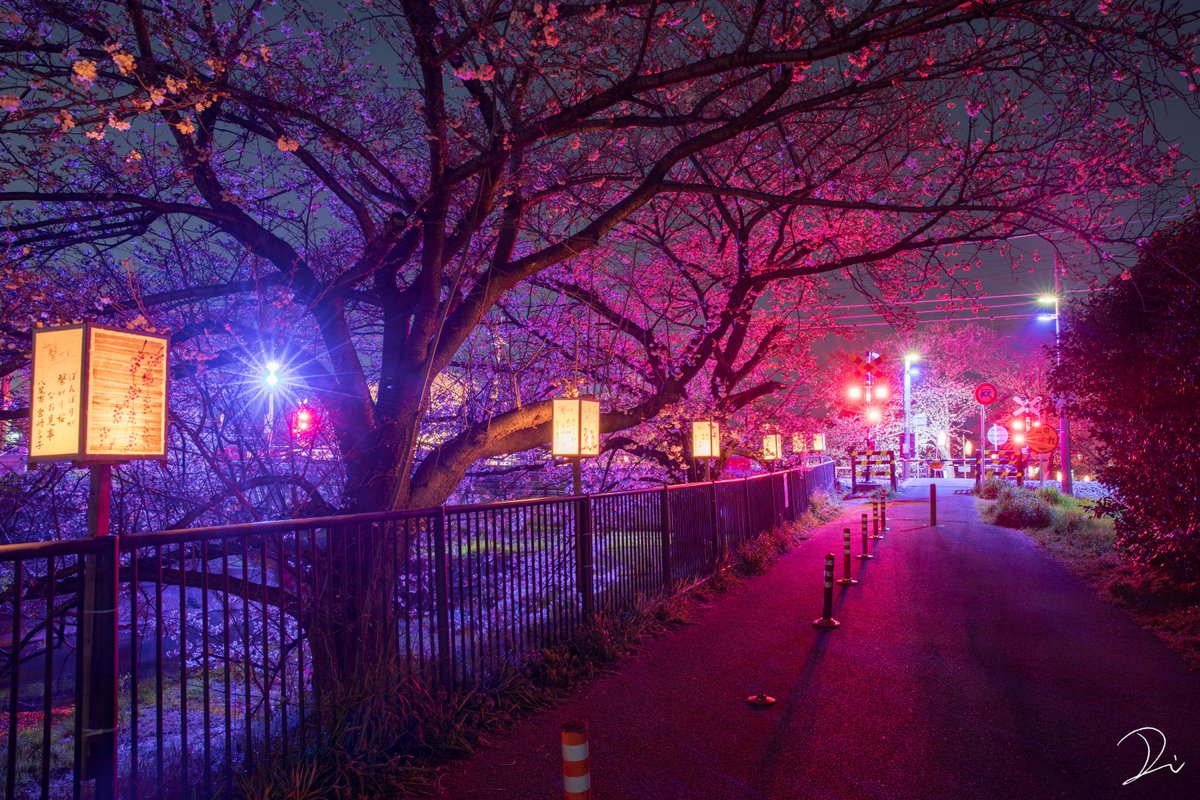 夜桜を染め上げる行燈の橙と青い外灯、踏切の赤と青が交わる。 そこはまるで異世界に迷い込んだかのような場所だった。 ヨモツヒラサカカミノマニマニ。pic.twitter.com/2JdqoYeTMb
