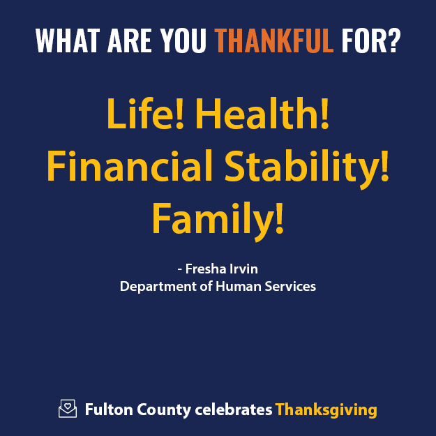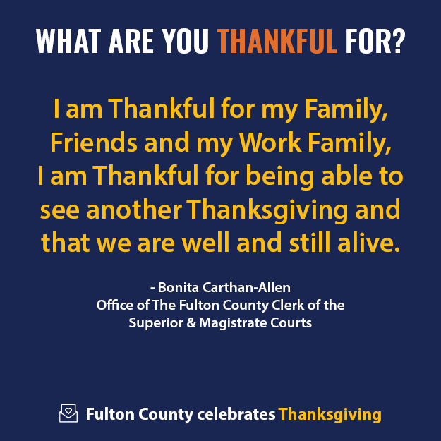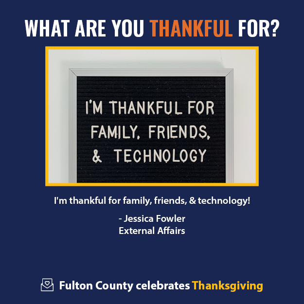 Happy Thanksgiving from Fulton County Government! Although celebrations may look a little different this year, there is still much to be thankful for. Take a look at what some of our hard working Fulton County employees are thankful for today.pic.twitter.com/p43TXjmazD