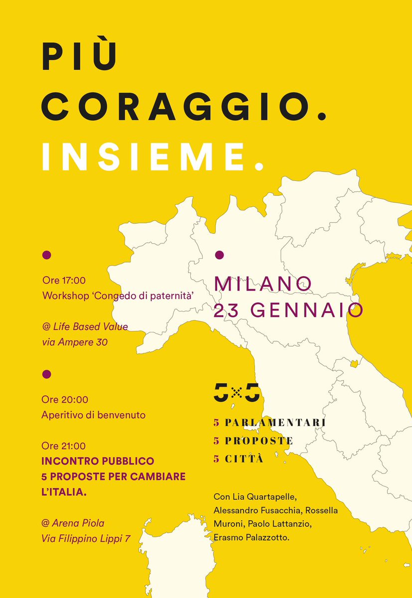 #5X5: giovedì 23 gennaio saremo a#Milano per presentare le nostre 5 proposte per cambiare il Paese e per sfidare il Governo ad avere più coraggio.