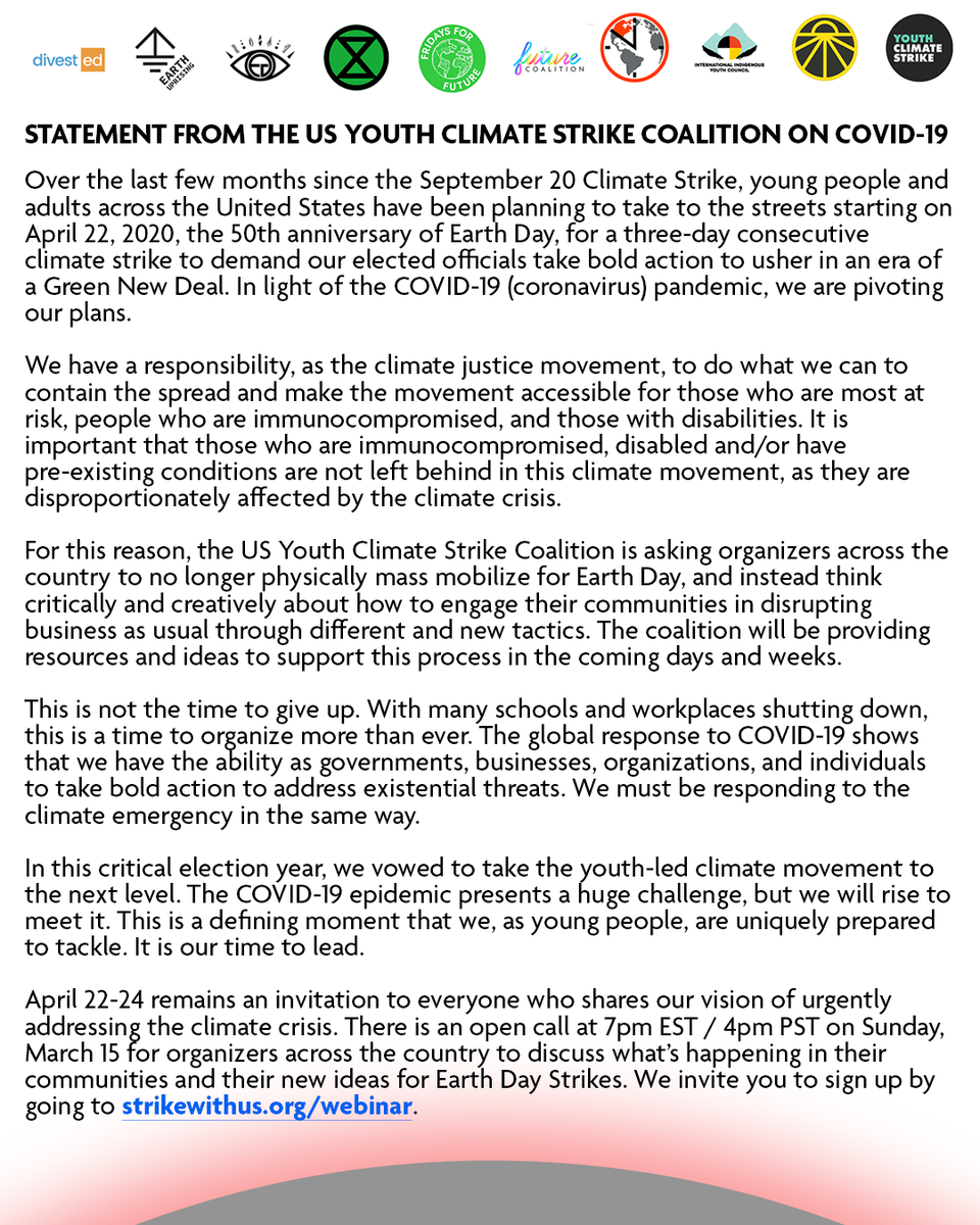 In light of the COVID-19 (coronavirus) pandemic, the US Youth #ClimateStrike Coalition is pivoting our #EarthDay Strikes plans. We are asking organizers to no longer physically mass mobilize — instead, we will think creatively about how to disrupt business as usual. #StrikeWithUspic.twitter.com/PQXmwcyapV