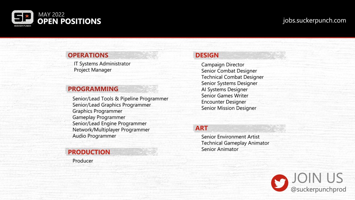 We're hiring! See all of our latest openings at https://jobs.suckerpunch.com