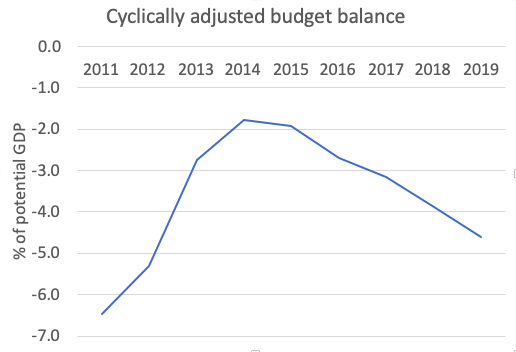 Another indication of how much Keynesian stimulus we're getting: CBO's estimate of the cyclically adjusted budget balance, which says that fiscal policy is as stimulative now as it was when the unemployment rate was still above 8%pic.twitter.com/xfNTNBKRxN