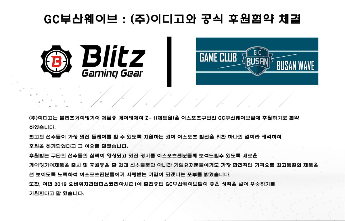 안녕하세요 GC BUSAN WAVE입니다.ฅ•ω•ฅ GC BUSAN WAVE가 (주)이디고 Blitz Gaming Gear와 공식 후원협약을 체결하였습니다! 자세한 사항은 아래 사진을 참조해주시기 바랍니다.pic.twitter.com/maF4v85eZA