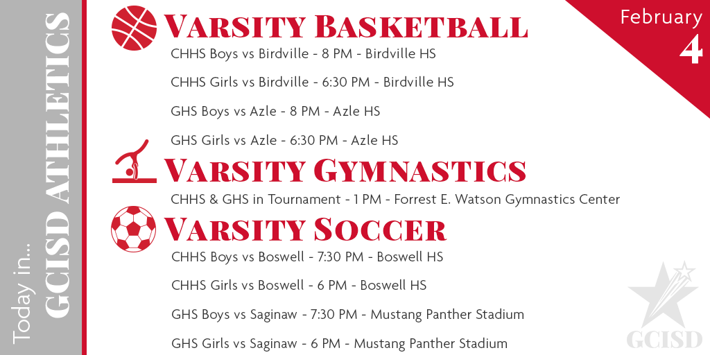 Classes will continue as scheduled on Wednesday, February 5. GCISD personnel will continue to monitor weather and road conditions throughout the day. Please visit the district website, http://www.gcisd.net , for additional updates.pic.twitter.com/Qof1kNvCnr