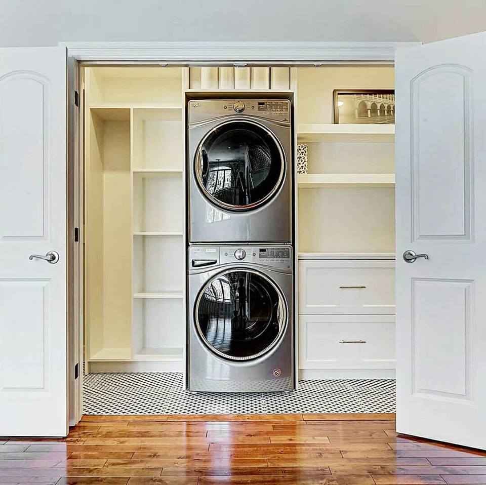 Front load washers/dryers are stackable, which means they will take up less room in a laundry space. This is perfect for closet laundry rooms such as this one. #Kbtribechatpic.twitter.com/BdsogyIWHA