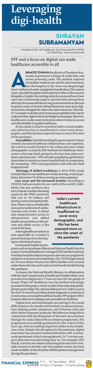 “PPP & focus on digital can make healthcare accessible to all. Strong healthcare system is non-negotiable in a country's growth journey from developing to developed.” Dr. Shravan Subramanyam, President & CEO, GE Healthcare, South Asia. Financial Express https://bit.ly/34p7FQw pic.twitter.com/JoCZXNIpQH
