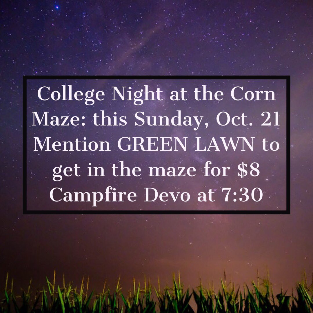 College Night at the Corn Maze: this Sunday, Oct. 21 Mention GREEN LAWN to get in the maze for $8 (optional) Campfire Devo at 7:30pic.twitter.com/37qRH7jbqe