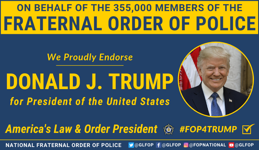 On behalf of the 355,000 members of the Fraternal Order of Police, we are proud to unanimously endorse @realDonaldTrump for President of the United States. #FOP4Trumppic.twitter.com/uAF6SWNRnA