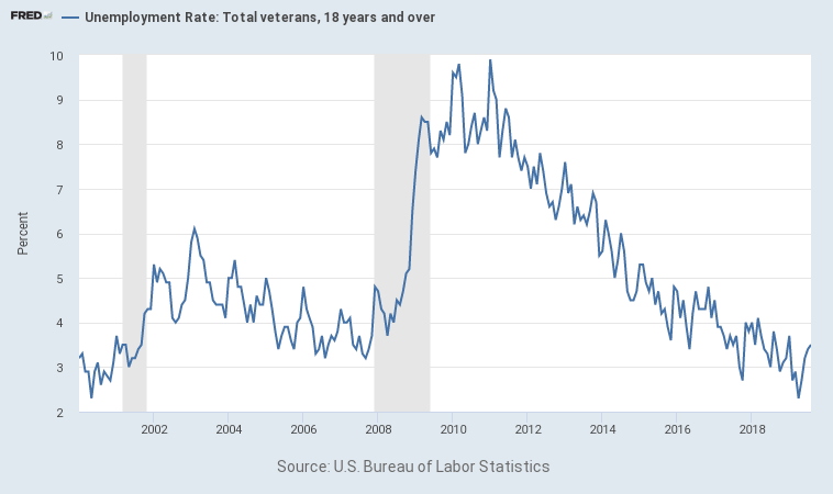 The unemployment rate among veterans is low & that's wonderful. Check out the trend since 2000. It's low thanks to progress since 2011, not any recent improvement in trend.pic.twitter.com/WOwV45RstF