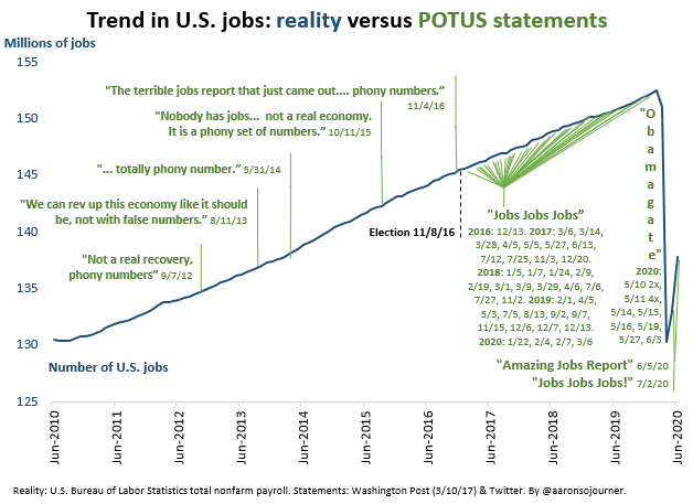 Check out trend in the # of U.S. jobs over the last 13 yrs. This administration inherited a strong job-growth trend when it started, which basically just continued but slower. In March & April, over 22 million jobs disappeared. In May & June, we regained about a third of thempic.twitter.com/6ManaZG77y