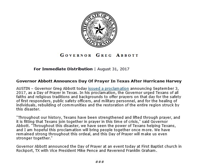 .@GovAbbott Announces Day Of Prayer In Texas After #HurricaneHarvey. pic.twitter.com/aQuLw7GWxa