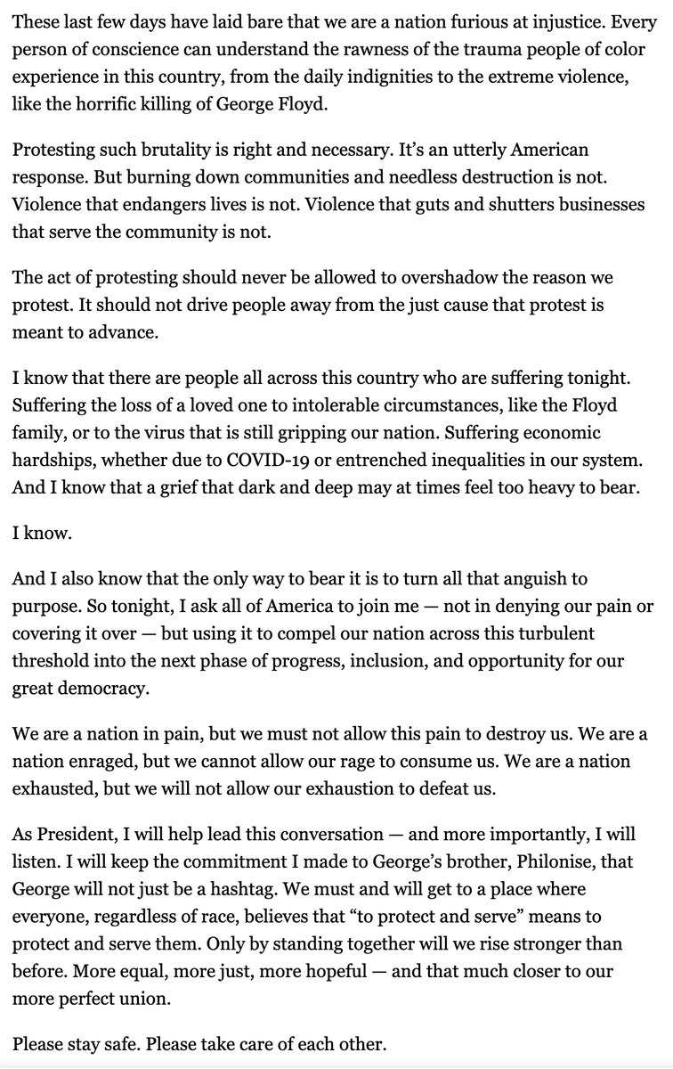Lying again? "Protesting such brutality is right and necessary. It’s an utterly American response. But burning down communities and needless destruction is not. Violence that endangers lives is not. Violence that guts and shutters businesses that serve the community is not."pic.twitter.com/jfmLaEnyvT
