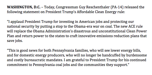 Pa coal jobs? How many are we getting because of this, five? Coal jobs were killed off by the success of the natural gas industry in your(our) district. Your support of coal is a losing proposition and makes you look out of touch with your district, as usual.