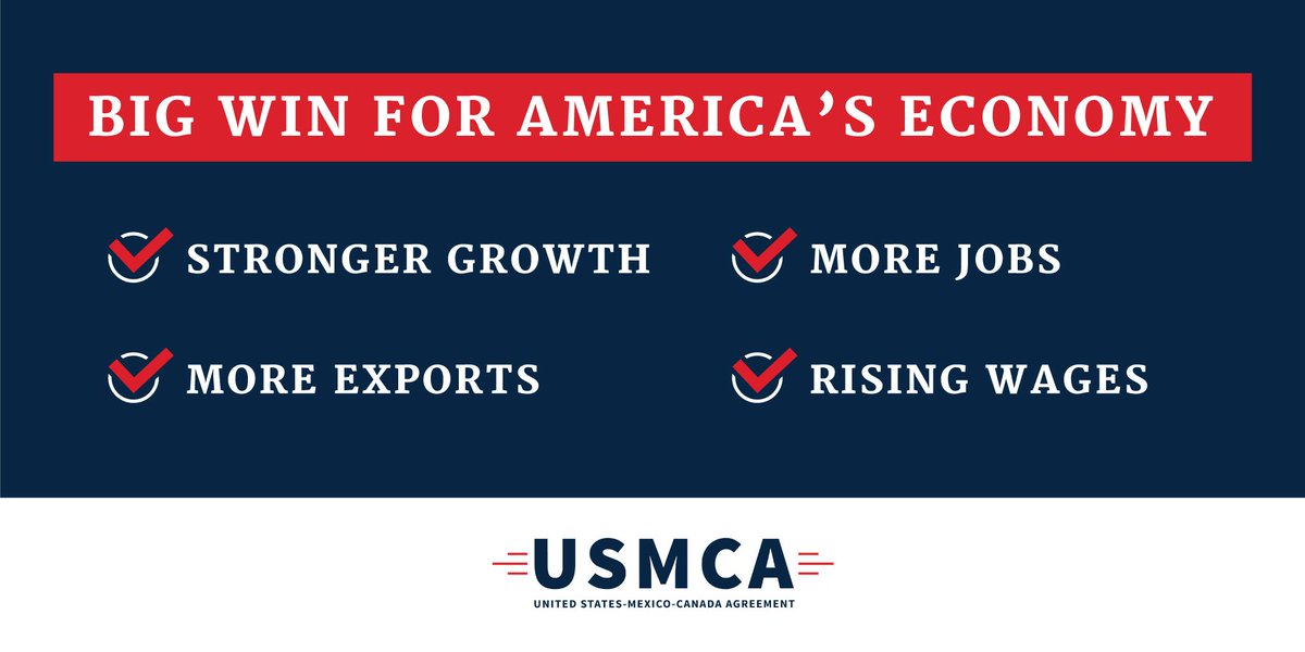 The USMCA negotiated by @POTUS will create over 170,000 new American jobs, raise wages, and encourage new investments in the U.S economy. I encourage Speaker Pelosi to bring this up for a vote. #USMCAnowpic.twitter.com/8XkSsMLdvD