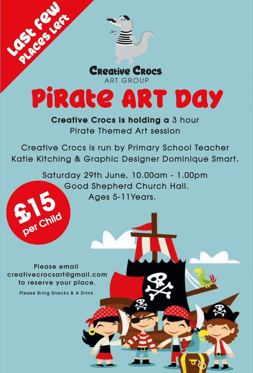 Creative Crocs is holding a 3 hour pirate theme art session. See poster for details. Last few places available...pic.twitter.com/vRapTD9vEX