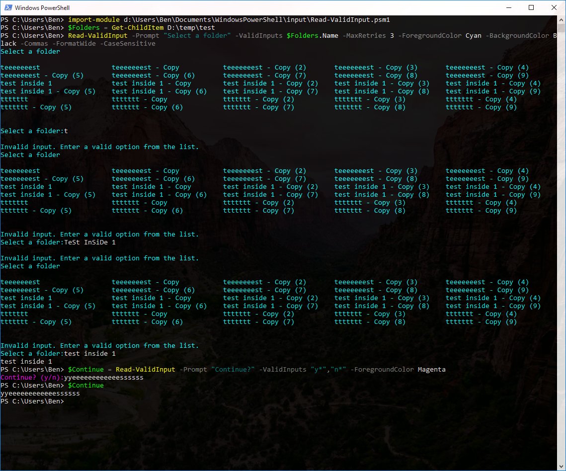 Created Read-ValidInput today. Help script-runners select from valid options only. Support for (y/n) lists and large table lists. Available: https://github.com/GSGBen/powershell …pic.twitter.com/Pd1G7KTmq1