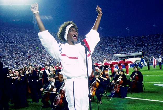 Super Bowl XXV, January 27, 1991, Whitney Houston performing 'the star-spangled banner,' Michael Jackson's half time performance at Super Bowl XXVII, January 31, 1993 and Prince performs at Super Bowl XLI, half time on February 4, 2007pic.twitter.com/9laUE5dmYp