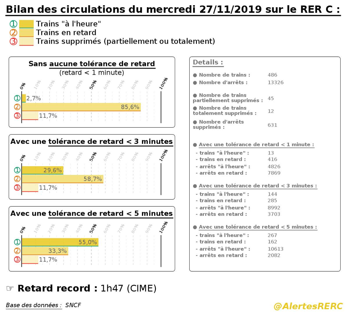 Ⓒ - #BilanCirculations du mercredi 27/11/2019 sur le#RERC : ➞ 2,7% de trains sans aucune irrégularité ➞ 54,9% de trains avec un retard < 5 min à tous leurs arrêts ➞ 11,7% de trains supprimés#Ponctualité#SNCFpic.twitter.com/B7Tnzg6aq9