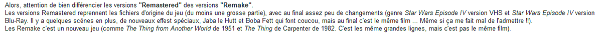On est d'accord ! J'aime bien la comparaison avec le cinéma, elle est pertinente. Même si le cinéma n'a pas (à ma connaissance) d'exemples comme dans le JV où on refait entièrement un jeu exactement de la même manière (Spyro, Crash, etc).