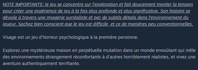 La conf de rédac' de ce lundi. L'équipe : "ce serait cool de faire un live sur Visage, mais j'pense qu'on a personne d'assez à l'aise pour faire ça" Moi : "osef c'est quoi votre truc j'ai pas peur je le fais moi" Eux : "ah bah super cool !" ... J'avais pas lu la page Steam.pic.twitter.com/9mwsLnuxhP