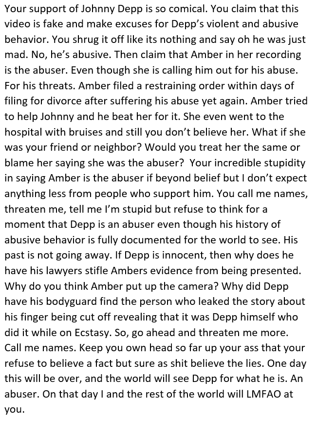 Go ahead and threaten me some more. Call me names. I enjoy reporting and blocking you. Depp is an abuser. Drunk and a drug addict.pic.twitter.com/Mip7Ow1zd8