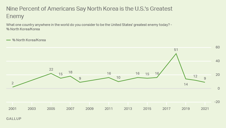 North Korea reportedly staged a series of test launches of cruise missiles over the weekend. Earlier this year, 9% of Americans said the country was the U.S.’s greatest enemy, down from 51% who said the same in 2018. http://on.gallup.com/3z8VkMW pic.twitter.com/wKJW9mxw80