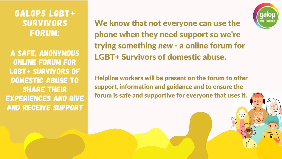 The National LGBT+ Domestic Abuse Helpline at Galop is proud to launch the LGBT+ Domestic Abuse Survivor's Forum! This is a safe, anonymous, online space for