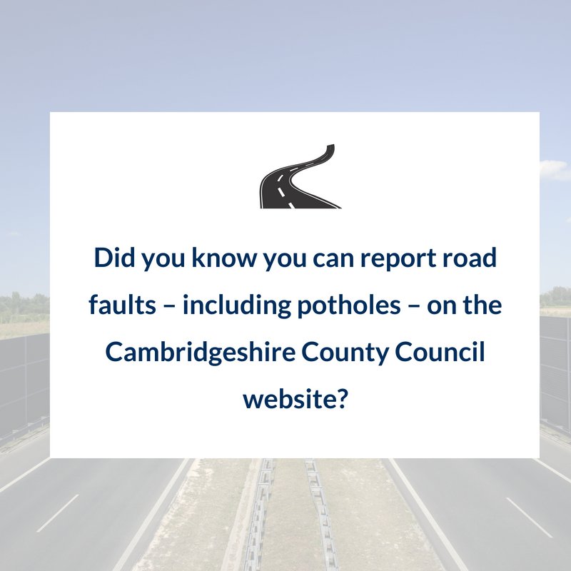 Did you know you can report road faults – including potholes – on the Cambridgeshire County Council website? Find out more and report a fault here http://ow.ly/hDlD30kmqmb pic.twitter.com/hoFwfFMWBA