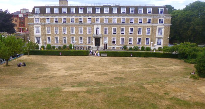 #heatwave has revealed these crop marks outside Shire Hall! They're traces of the old county prison which used to stand here and from whose bricks much of Shire Hall was built. The marks show the external wall, main entrance & the ground floor rooms of the governor’s house!pic.twitter.com/JR7bEuG0bJ