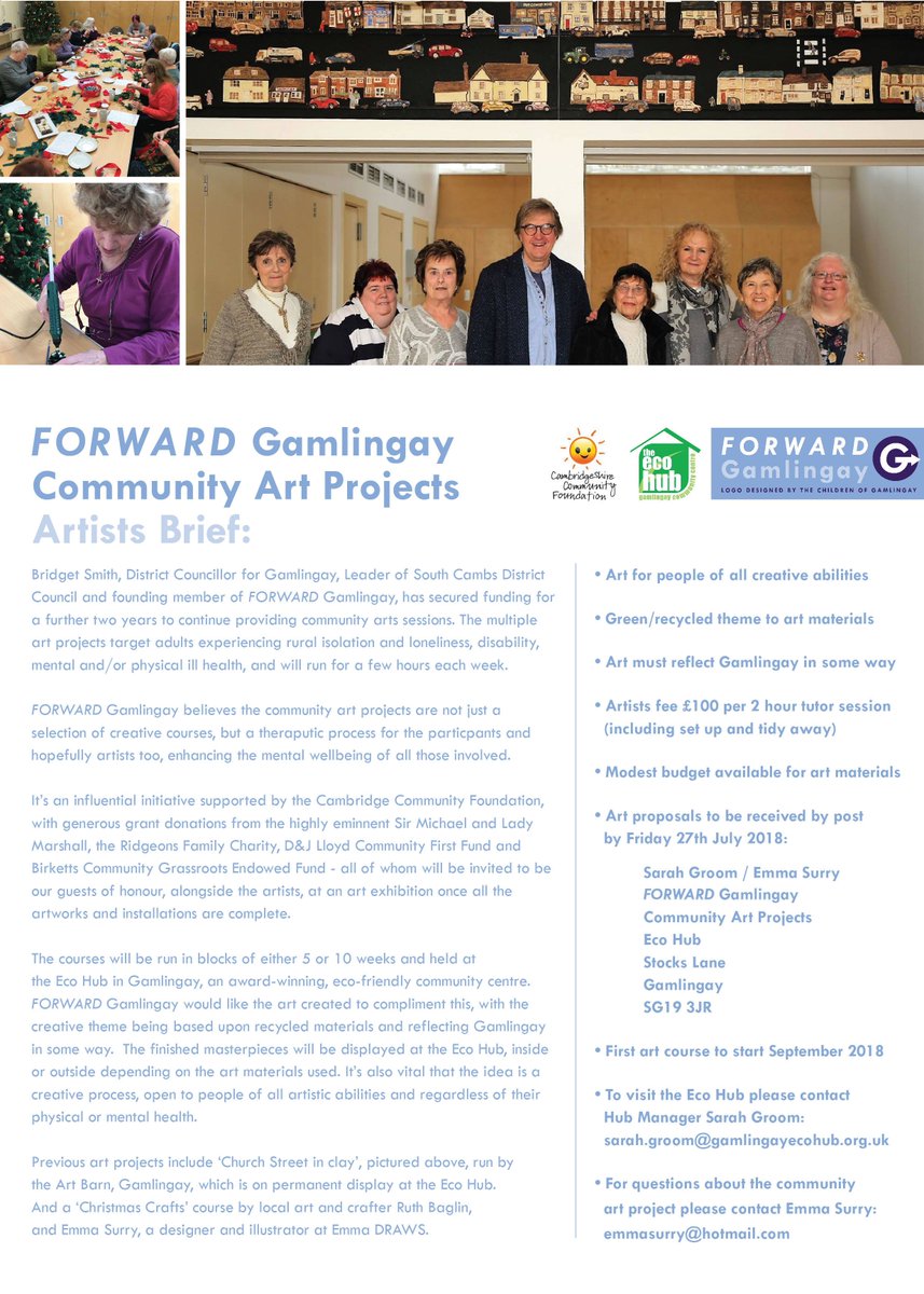 We are looking for art tutors to deliver our next great art project for Gamlingay! We need someone used to doing community art, with bright ideas and who likes working with people. Please contact Emma Surry for more details Emmasurry@hotmail.compic.twitter.com/BupYj4pIsJ