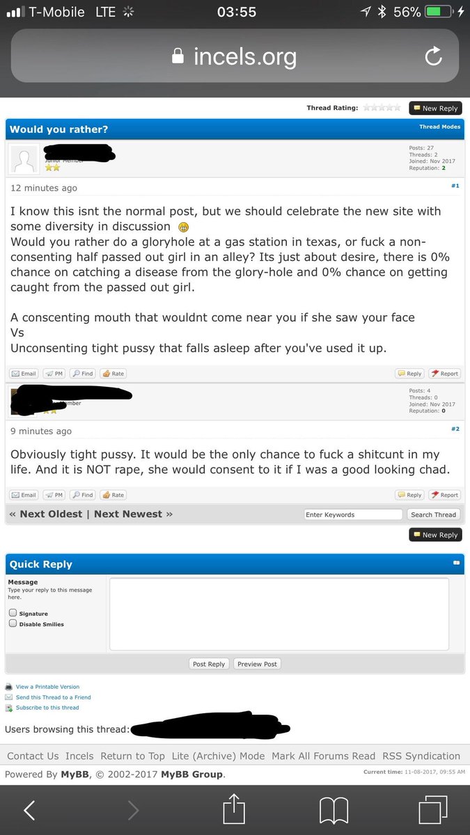 Alright, expanding on this to show you the seriousness of Incels as a hate group. CW: discussions of rape and sexual violence Elliot Roger was quite obviously an Incel as frequently went to forums that discussed those themes. Incels advocate for rape and murder there.