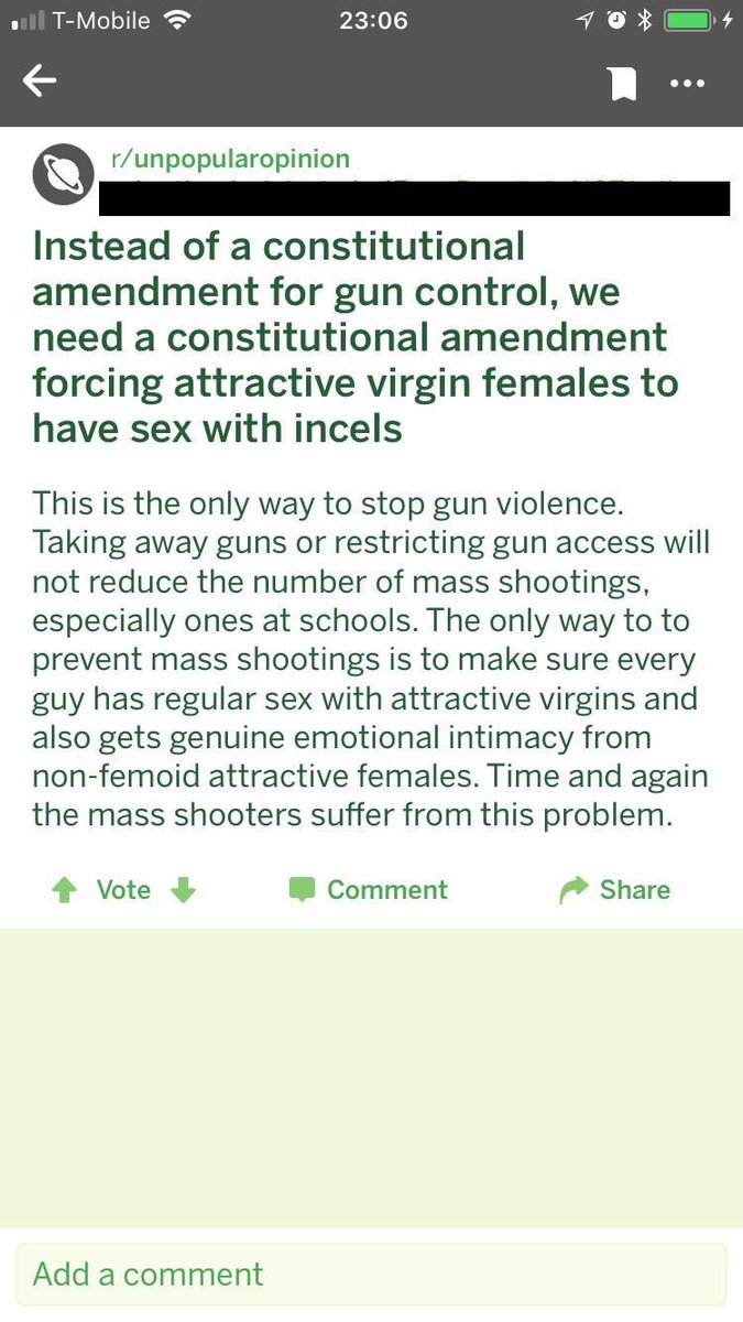 Furthermore, Incels has frequently voiced suggestions of state-incentives to force female virgins to have sex with male Incels to lessen their desires to go on a gun rampage. To them, the root cause is the denial of sexual intimacy. Twist your head around that.