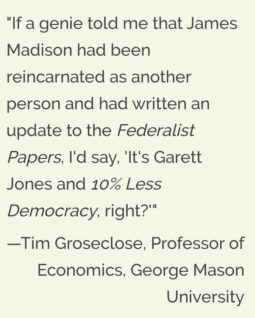 @Tim_Groseclose something like a sequel to the Federalist Papers--with its quest for balance between voters & elites. I emphasize this in the conclusion. Kind words: https://www.amazon.com/10-Less-Democracy-Should-Elites/dp/1503603571/ref=mp_s_a_1_2?keywords=10%25+less+democracy&qid=1571584076&sprefix=10%25+less&sr=8-2 …pic.twitter.com/lXcgunBmyY