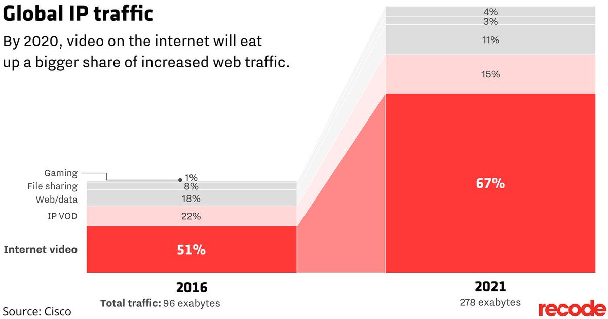 An explosion of online video could triple bandwidth consumption again in the next five years https://www.recode.net/2017/6/8/15757594/future-internet-traffic-watch-live-video-facebook-google-netflix?utm_campaign=www.recode.net&utm_content=entry&utm_medium=social&utm_source=twitter … via