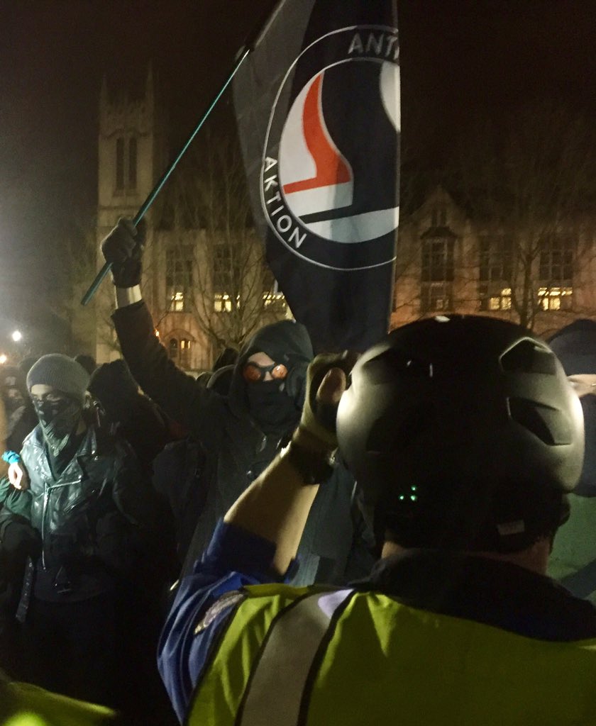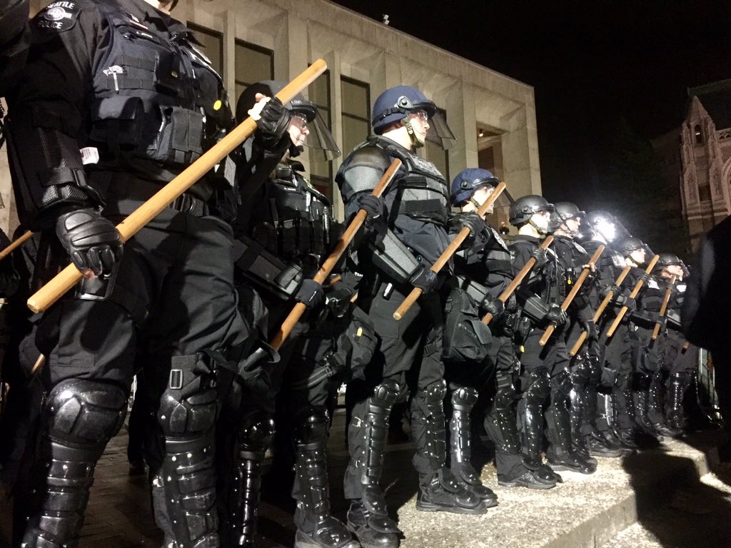Police clad in riot gear surround red square on the University of Washington campus after someone in the crowd of protesters was shot.pic.twitter.com/u7366x5SSo
