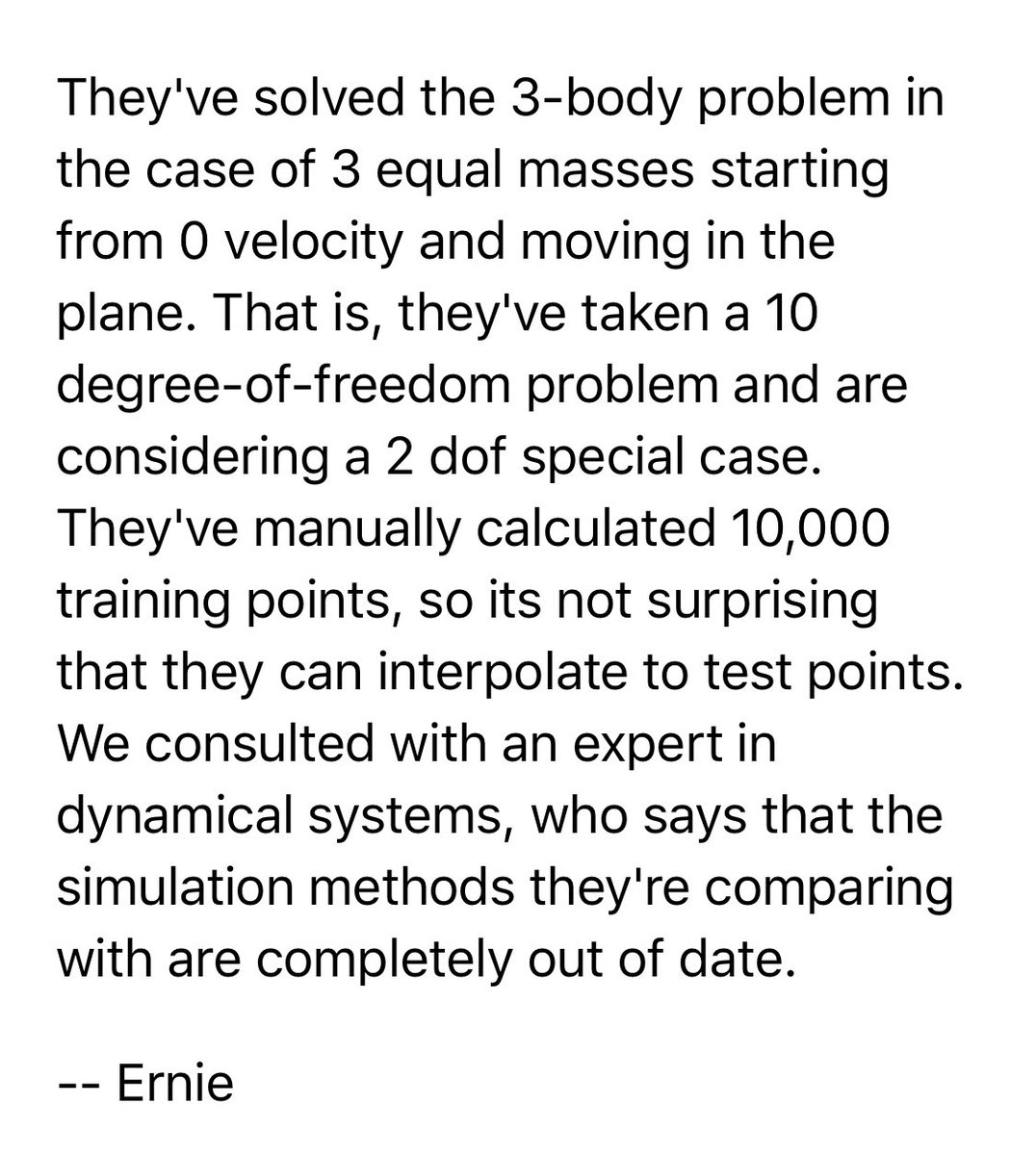 I don’t know nearly enough about the three-body problem to comment on this. However, it so happens I know more than most people in the world about a number of big challenges being tackled by DL researchers. Sad to say, a severe lack of domain knowledge abounds. 2/2